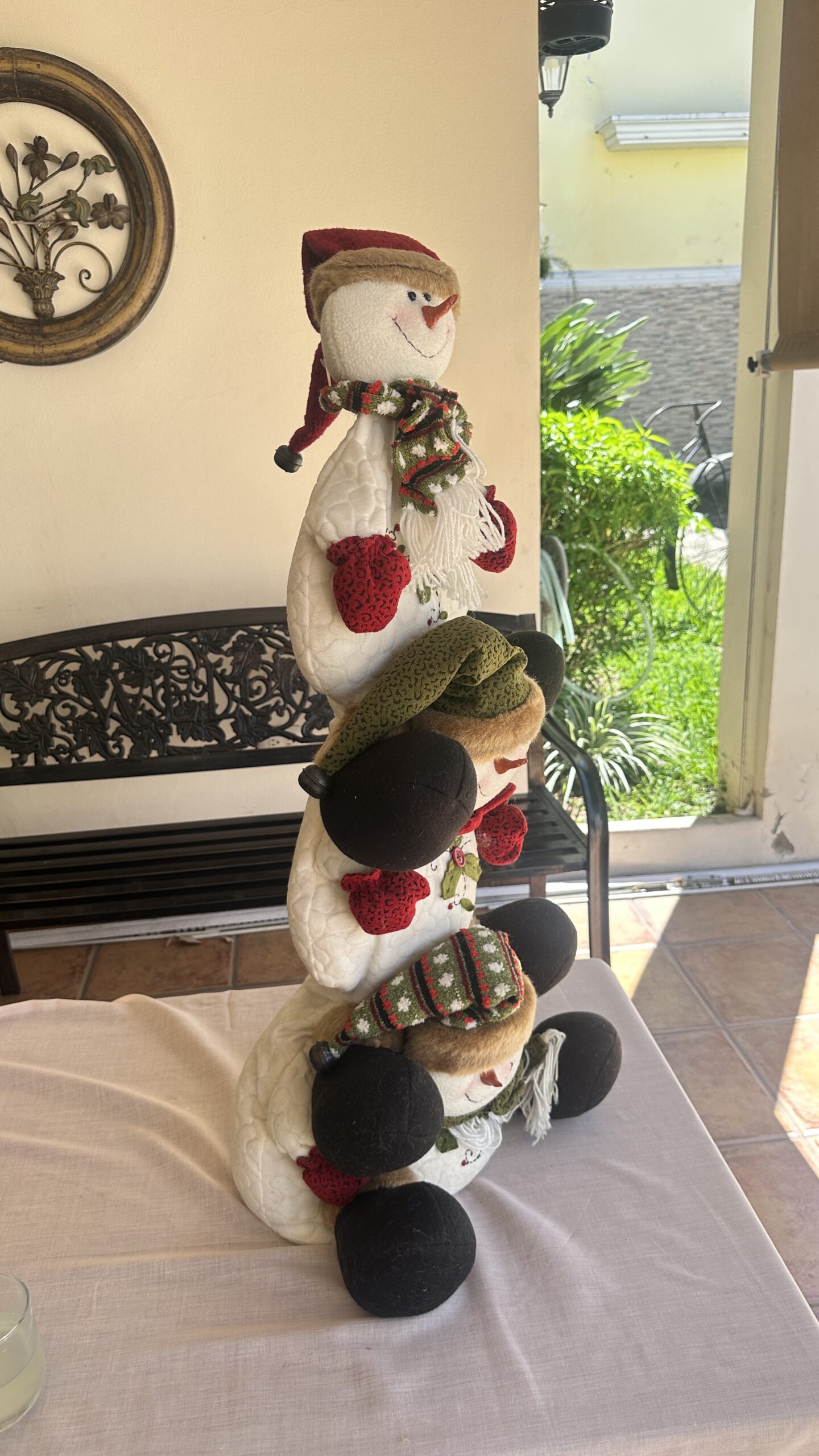 Construye tu propia escena de invierno con esta decoración apilable. Tres sonrientes muñecos de nieve forman un ‘tótem’ festivo que puedes ajustar en altura según tu preferencia. Es una pieza alta (29 pulgadas) que causa un gran impacto visual.
