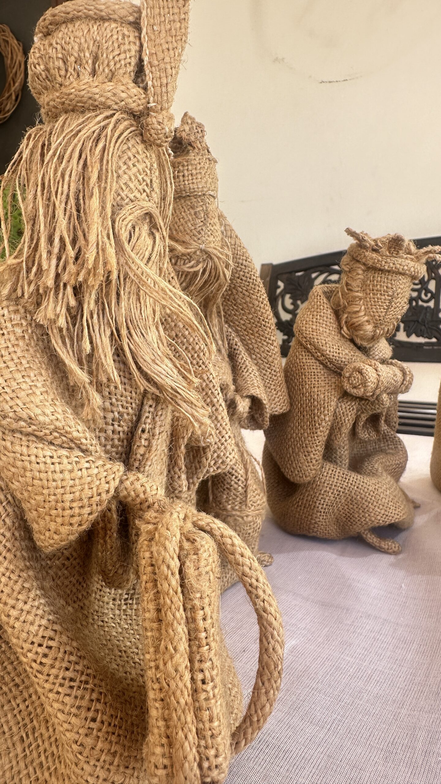 Celebra el origen de la Navidad con este pesebre único. Las figuras, elaboradas artesanalmente con yute, ofrecen una estética rústica y cálida que se diferencia de las tradicionales figuras de cerámica o resina.